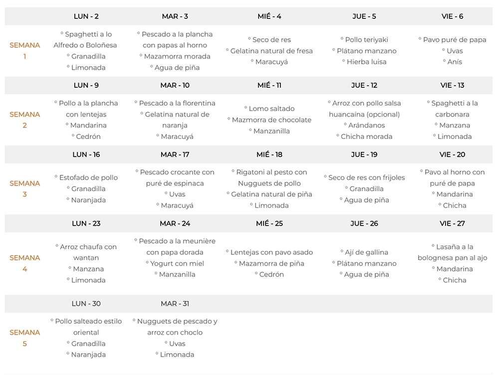 | SEMANA 1 | ° Spaghetti a lo Alfredo o Boloñesa ° Granadilla ° Limonada | ° Pescado a la plancha con papas al horno ° Mazamorra morada ° Agua de piña | ° Seco de res ° Gelatina natural de fresa ° Maracuyá | ° Pollo teriyaki ° Plátano manzano ° Hierba luisa | ° Pavo puré de papa ° Uvas ° Anís |