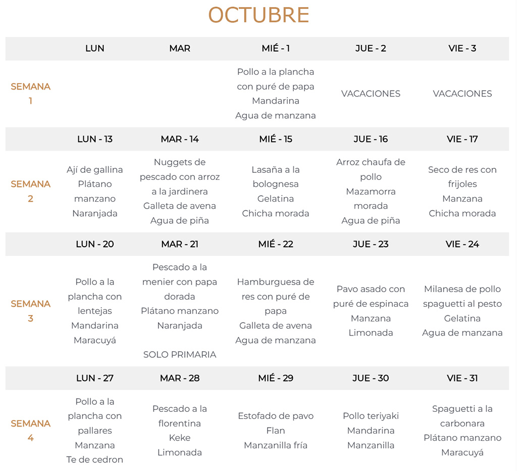 LOS ALUMNOS QUE NO DESEAN MEZCLAR CARBOHIDRATOS O NO INCLUIR EL ARROZ, AGRADECEREMOS LO INDIQUEN AL INICIO DE CADA MES.